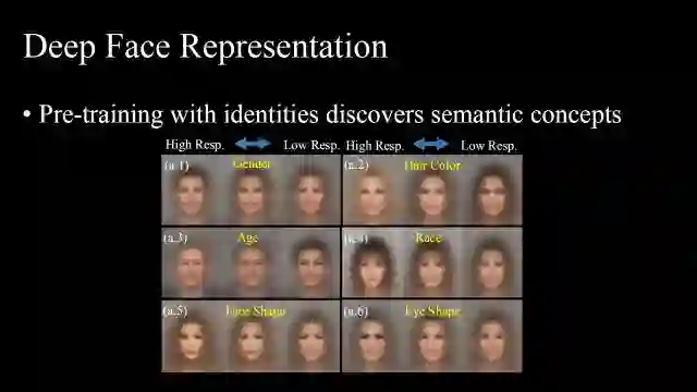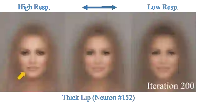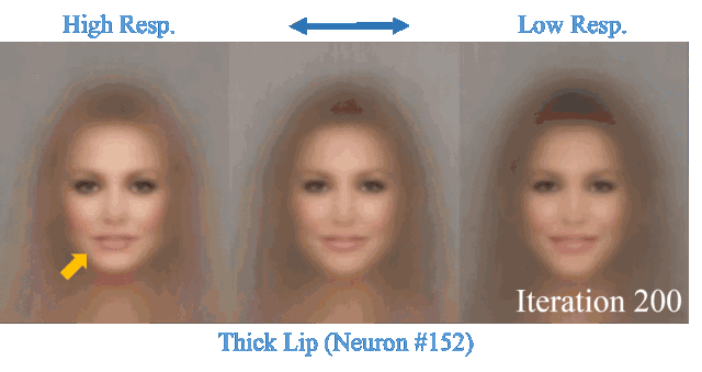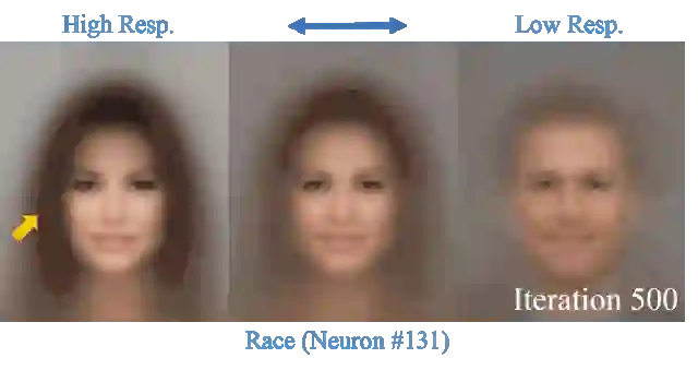随着训练迭代次数的增多,神经元慢慢发现了种族信息,它的高响应结果是“亚洲人”、低响应结果是“欧洲人”。