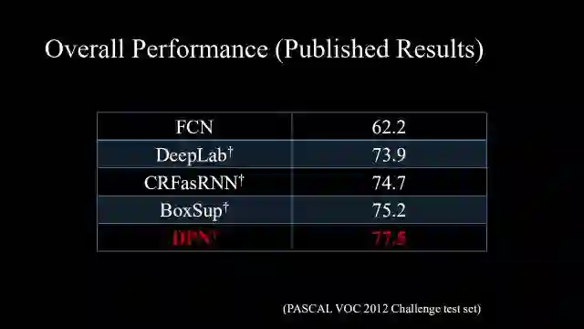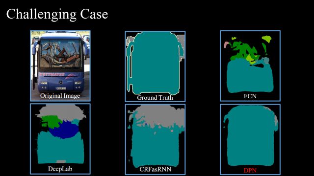 如图,我们发现unary term会漏掉图像中的部分目标,且边界较粗糙;通过triple penalty,判断两个标签的相似度来修正它的预测标签,可以将边缘变得较尖锐;然后通过label contexts判断这里很有可能是一个盆栽;最后通过整体三个部分一起做训练,来得到最终结果,非常接近groundtruth。