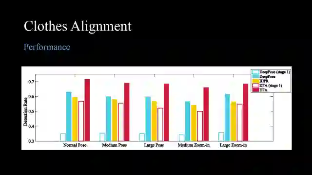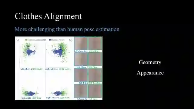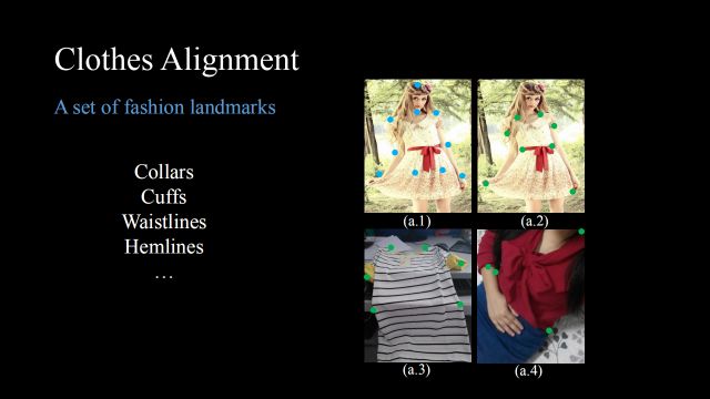 第一步检测是较容易的,可以使用一些通用检测器。比较困难的是对齐,首先定义一组衣服的关键点,比如领口、袖口、腰身、下摆等位置,但是服饰的关键点和人体关键点还是有很多差异。比如(a.1)中蓝色的是人体关键点,而(a.2)中绿色的是衣服的关键点。(a.3)中衣服并没有穿在人身上,所以无法依据人体关键点来检测衣服关键点,而(a.4),在自拍状态下很多关键点被遮挡,一些姿态检测器不能起作用。因此,服饰关键点检测比人体关键点检测更可靠。
