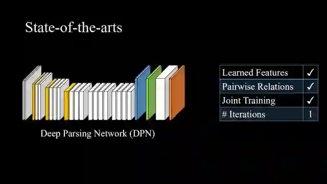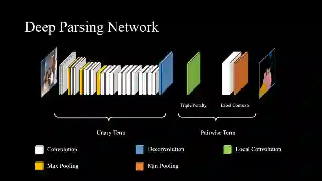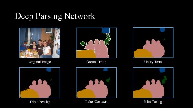 这是我们的深度解析网络,unary term可以是很强的VGG或者ResNet,然后通过triple penalty和label context学到一个结果。