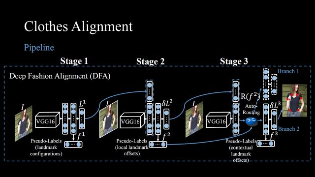 我们设计了如图算法流程,通过级联的神经网络做对齐,每一个阶段都是一个回归问题,也就是给一张图片,通过一个基网络(比如VGG16),经过几个全连接层回归其坐标,比如有8个关键点就回归16个坐标(x,y)。第二个阶段通过学第一个阶段的增量来优化其结果,但是,衣服的变化是很大的,如果仅仅直接做深度回归学习的话,对于一些中等难度或难度较大的样本效果是不好的。