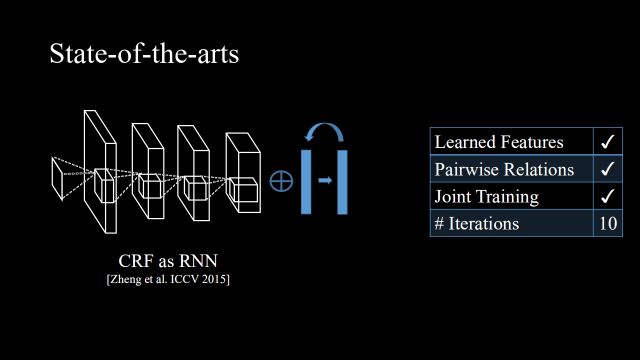 当时同时还有一个工作叫“CRF as RNN”,它相对于DeepLab能够进行端到端地训练,但是依旧需要迭代十次。
