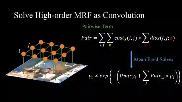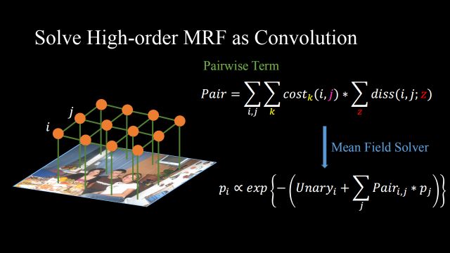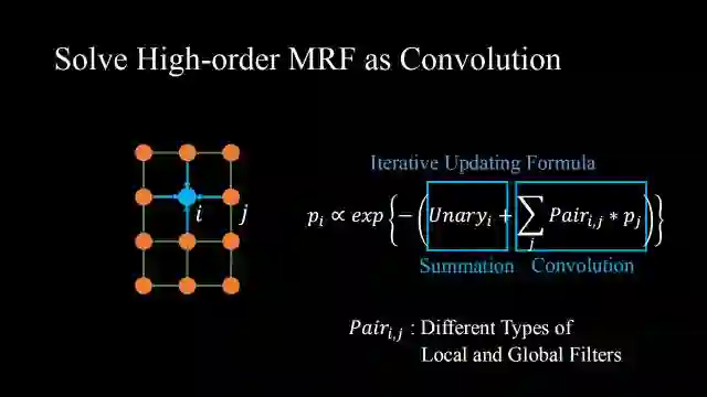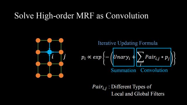 然后把一元项和成对项变成卷积和求和形式,然后就可以用我们现在一些标准的神经网络操作来解决该问题。其中,Pairi,j代表了不同类型的全局和局部滤波器。