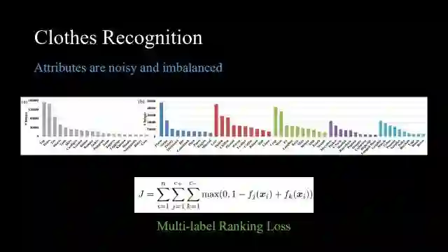 但是上述三个部分的损失都不容易设计,都不能直接用现有简单的损失函数(比如cross entropy、softmax loss)解决,因为服饰的类别和属性数量都是非常大的,一般的损失函数很难转换,所以我们首先对属性做了一个直方图统计,如图,它是一个长尾型的分布,而且对于在线图片而言,具有较多噪声,因此我们提出了Multi-label ranking loss,ranking loss的本质精神只关心正确的比错误的分高,而并不关心真正能够分对的标签是什么,它对噪声非常鲁棒,而且某种意义上能够解决数据不平衡问题。