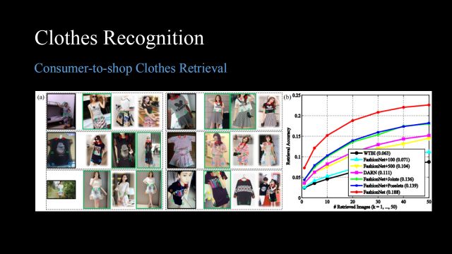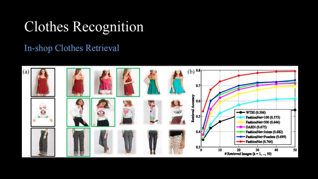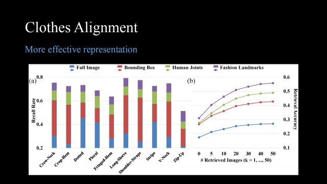 以上我们讲述了如何做服饰关键点检测, 那么我们为什么要做呢?其实服饰关键点提供了一个非常有效的表达,(a)图是服饰属性预测的结果,(b)图是用服饰做检索的结果,我们发现当用服饰关键点时,它的效果要优于用人体关键点、bounding box、全图来检索。因此,尽管服饰关键点检测是一个具有挑战性的问题,但是它是非常有意义的。