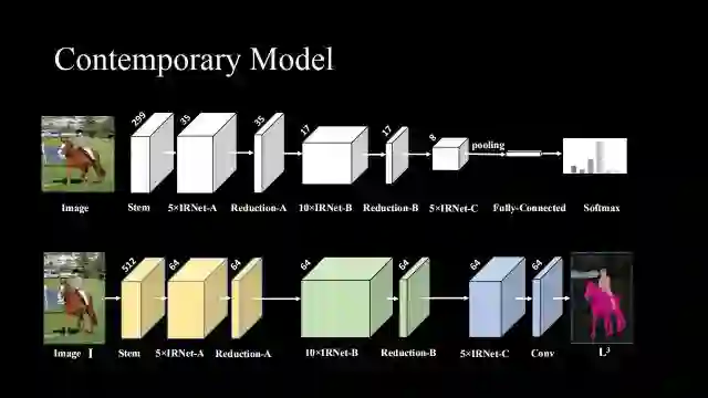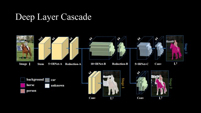 因此,我们把contempotary model变成Deep Layer Cascade,上面是一个做分类任务的网络ResNet,下面是把ResNet变成一个做分割任务的网络,每一个卷积层都需要给它一个比较大的特征图。