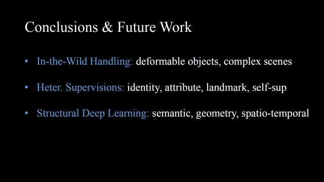 以上和大家分享的是人脸方向的一些工作,主要分为两个方面,首先,人脸属性可以做人脸预测,不需要bounding box标注;其次,用身份信息做预训练其实可以把人脸空间做一定的分解,能够发现很多属性信息。