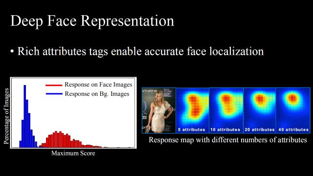 如何做定位呢?首先验证为什么人脸属性信息可以做定位,我们用直方图统计了训练好的卷积神经网络在人脸图像和背景图像上的响应,可以看出人脸和背景有明显的分界。从右图可以得知,使用愈加丰富的人脸属性信息可以得到愈加精确的定位。