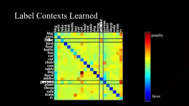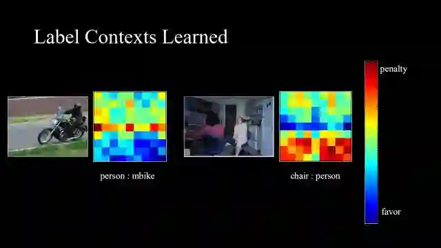 所以我们关心label contexts究竟能否学到所谓的结构化关系信息,颜色偏红表示否定,偏蓝表示肯定,普通的ResNet和VGG容易把摩托车和自行车这两种混淆,我们通过label contexts把二者区分开来;第二,我们看到一个favor,我们希望人和摩托车能够一起出现,这也是非常合理的,因为摩托车上一般会有人。