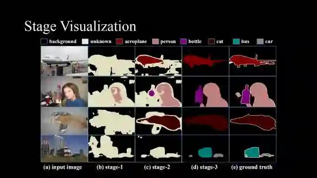 这是对每一阶段的可视化结果。我们看到从第一阶段到第三阶段,网络逐步从认识较容易的背景区域到较难的关键物体区域,越来越接近groundtruth。