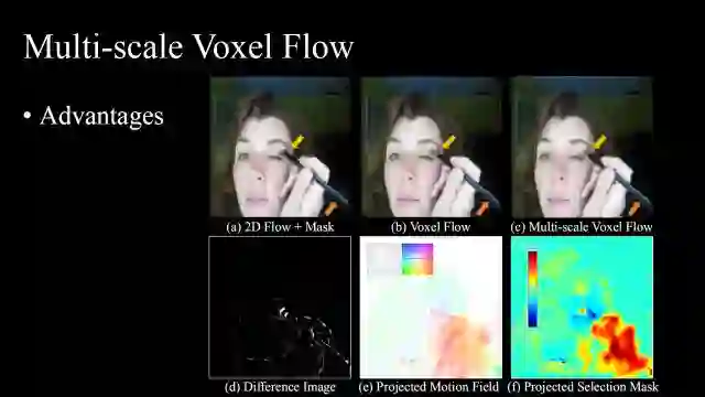 如图,是从2D flow+ mask到多尺度体素流方法的演变及其效果,可以看到学到的motion field和selection mask是非常匹配的。