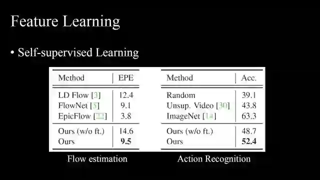 另一个比较有意思的地方是,尽管这个网络学到的是重构这一帧,但是它学到的特征依然可以用于high-level的视觉任务,比如这里无监督的光流表现的不错,而且神经网络学习到的权重也可以被应用到行为识别中去,这与learning-by-prediction思想类似,通过预测或插值中间帧和下一帧,学到比较有效的视频表示。