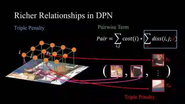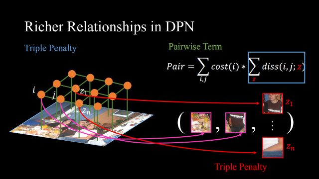 这里重点讲我们设计的两个比较特殊的公式。首先是triple penalty,一般只考虑i,j两点,它们相似那么其标签就一致,这里我们还考虑z1...zn这个邻域,好处是当i,j不确定时,可以参考z邻域的信息来得到更精确的估计。这里对于i,j和z的联合计算可以很好地模拟图像中广泛存在的长程一致性。