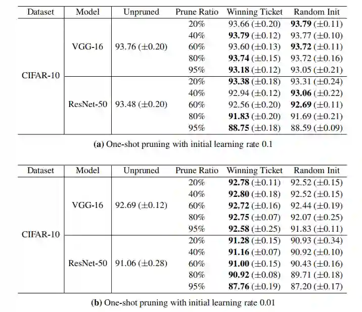 中奖票只在非结构化剪枝下、初始学习率较小时有效,其余时候不如随机初始化的性能好