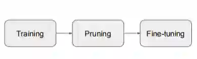 的思想,即将网络中某些对输出结果贡献不大的参数进行剪除。这种方法可以大大提高模型运行速度,但同时会对模型准确度有一定影响。经过近 30 年的研究,现在的神经网络剪枝技术可以减少训练网络时 90% 以上的参数,以减少存储需求,提高模型的推理计算性能。通常的网络剪枝步骤如下图 1 所示,首先训练一个大的、过参数化的模型,然后根据一定的准则对训练过的模型参数进行修剪,最后将修剪过的模型微调以获得失去的精度。