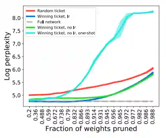 首先,在 Wikitext-2 数据集上对 LSTM 模型的实验中发现,在所有修剪程度上,有 last rewind(即 lr)的中奖票性能明显优于随机票(图 12)。有趣的是,去除 lr(绿色线)对模型性能只有轻微的损坏。这表明对于 LSTM 语言模型来说,lr 方法不太重要。但是迭代修剪是必不可少的,比如使用一次修剪方法(one-shot)时,一旦 80% 的参数被修剪模型性能会急剧下降。这些结果共同验证了中奖彩票在 LSTM 语言模型的有效性。