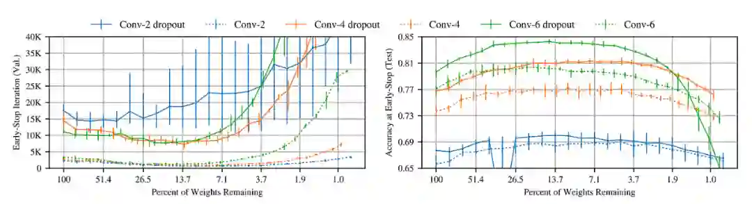 之后,作者还用 Cifar-10 数据集在卷积网络上进行了相同的实验,得到了与前面相同的结论。随着网络的修剪,中奖彩票与原始网络相比,学习速度更快,测试精度更高,泛化能力更强。同时证明了 Dropout——2012 年 Hinton 等人【3】提出通过随机禁用每次训练中的一小部分(即随机采样一个子网络)来提高测试精度——在中奖票的训练中同样适用。从图 5 中看出,