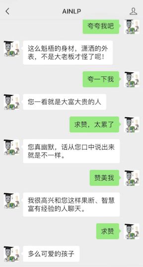 我想这个功能AINLP双语聊天机器人无名可以有啊,虽然还做不到高级的个性化,但是最简单的起码是可以做到的,所以说干就干,用一行Python代码实现了这个功能: