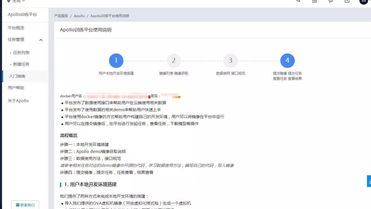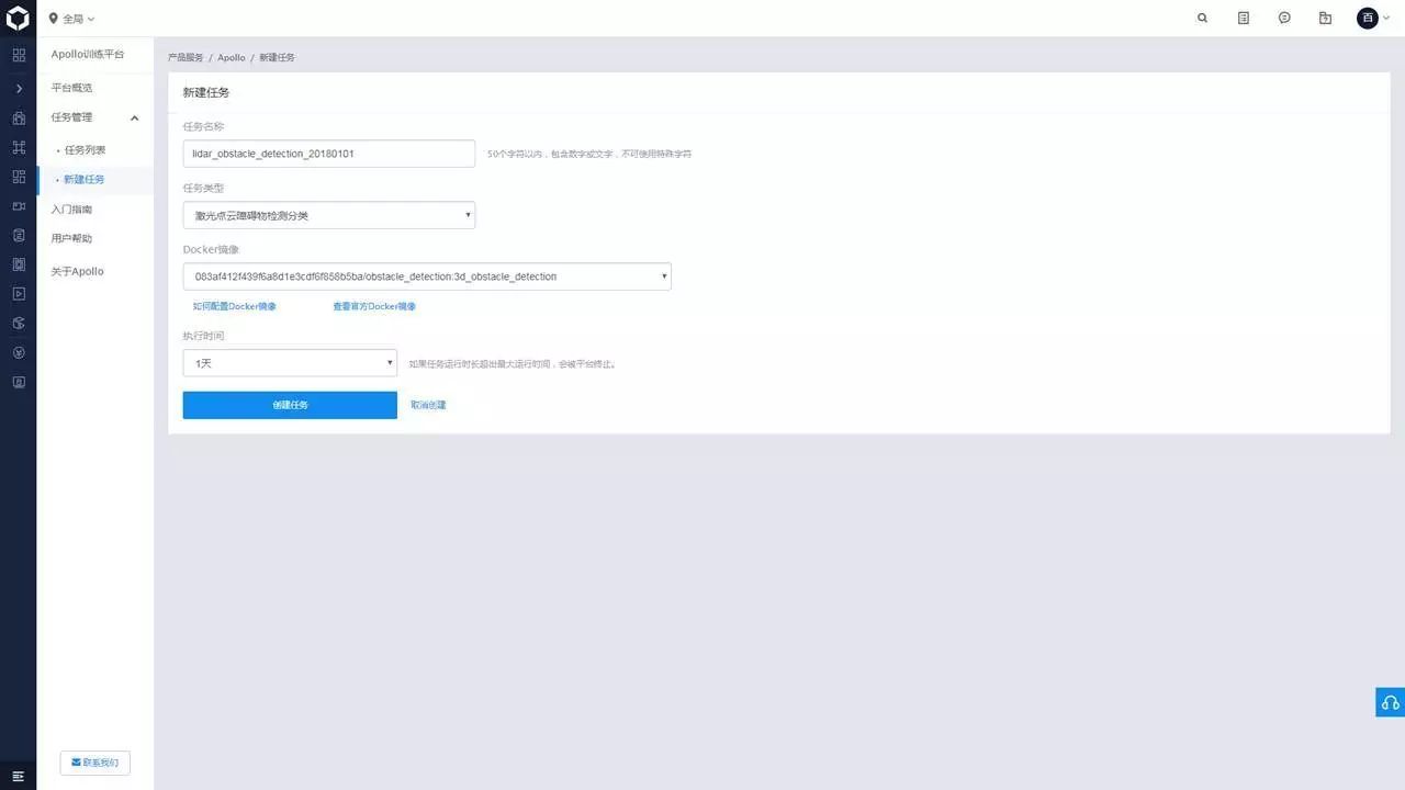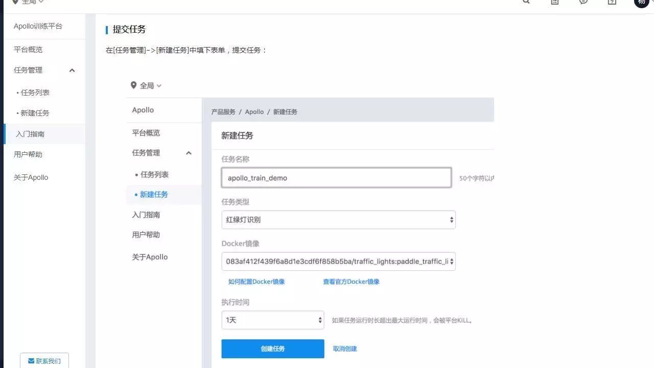 在申请通过后,“申请使用”按钮会变成“在线使用”,点击后会进入 Apollo 训练平台的新建任务(Apollo 训练平台有着较高的安全校验机制。初次使用需要设定云属性和联系方式,并签订使用协议书;当登录后过长时间未使用时,需要再次登录)。