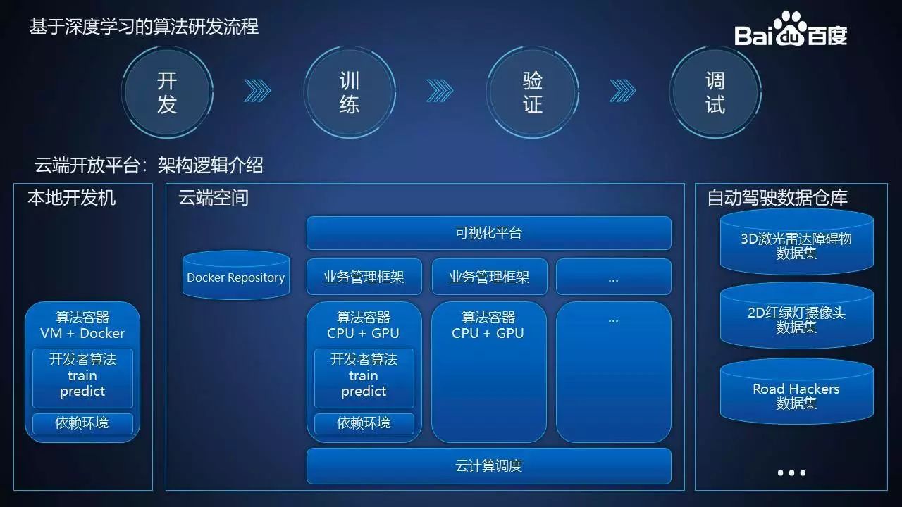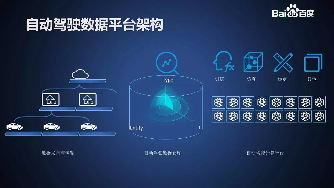 百度自动驾驶有非常强的能力来源于云端的。高精地图存储于云端,用以模拟驾驶的仿真服务也在云端,它加速了自动驾驶的研发效率。我们积累了大量的数据和对数据的理解。我们在云端也开放了数据平台,把数据加工的主线,在我们云端来体现出来。在云端还有我们的安全服务,保证软件的自动更新。
