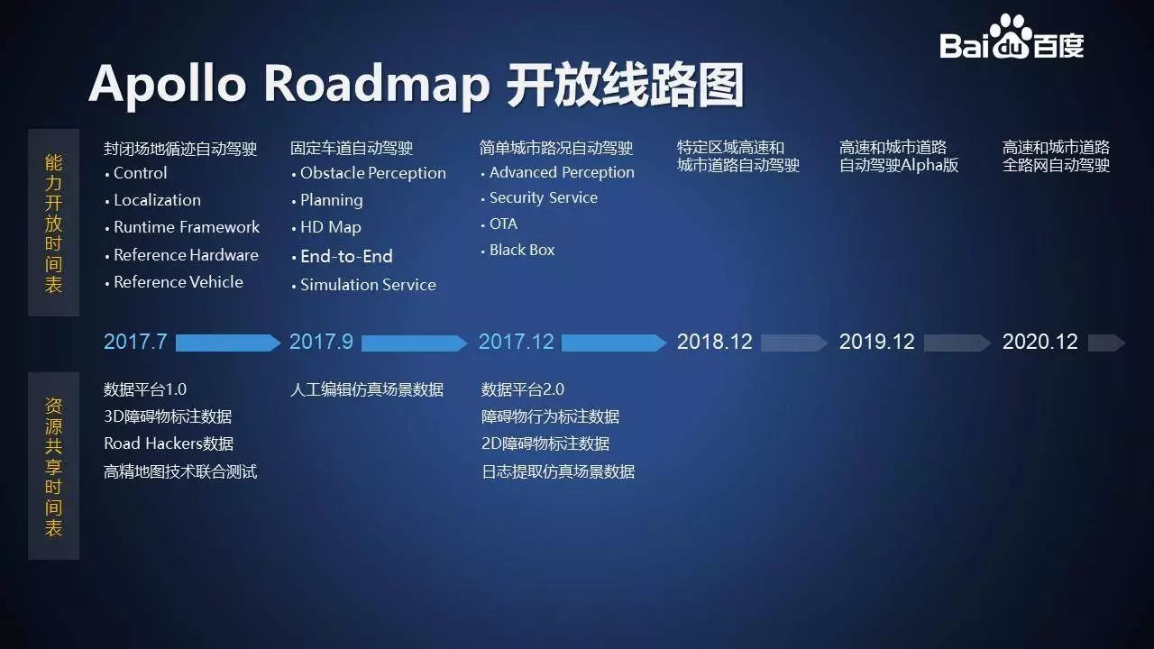 在 2017 年 7 月 1.0 中开放封闭场地循迹自动驾驶能力和资源,在 9 月 1.5 中开放固定车道自动驾驶能力和资源,在 2018 年 1 月 2.0 中开放简单城市路况自动驾驶能力和资源,之后会在 2018、2019、2020 年逐步开放特定区域高速和城市道路自动驾驶能力和资源,高速和城市道路和自动驾驶 Alpha 版,并最终到达高速和城市道路与全路网自动驾驶能力和资源。