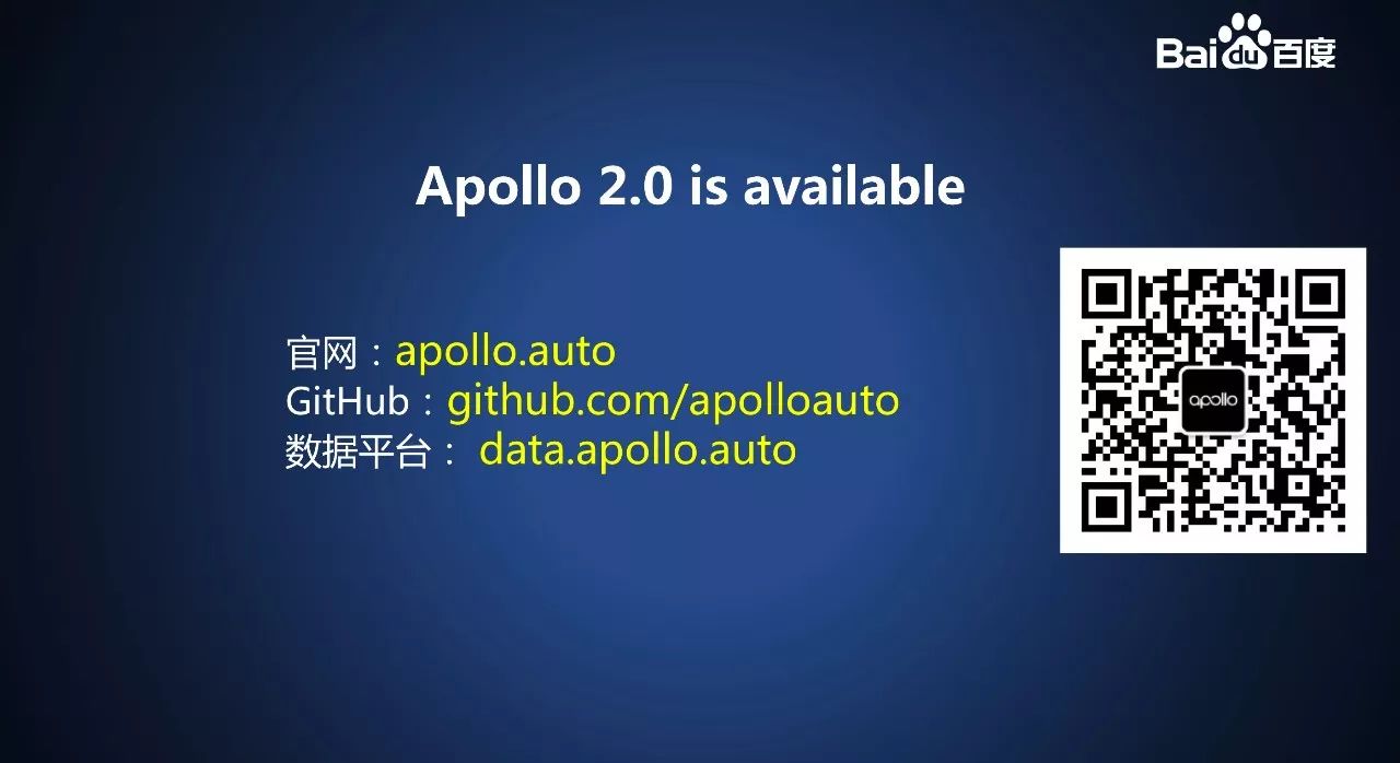 自 4 月 19 号宣布开放后,收到很多伙伴的反馈,其核心总结为 Apollo 宣言。自动驾驶行业正在快速走向未来,而最大的痛点在于技术壁垒太高,每个企业需要技术与人力的多年积累,才可以进入实质的研发。百度起步较早,有将近 4 年的技术积累,投入较早,将把能力开放给每一个合作伙伴,从 0 到 1,很快进入到无人驾驶的研发,从而提高无人驾驶行业的创新速度,避免重复造轮子。大家都把精力放在更有效的创新上。共享资源,合作伙伴使用 Apollo 技术资源,拿来即用;同时,每个合作伙伴,都可以贡献资源,贡献得越多,得到的越多。Apollo 受益,合作伙伴更受益。加速创新:数据加创新,汇集数据资源,公里数,覆盖的场景数,以后将远远大于任何一个封闭的体系持续共赢:百度的商业模式,基于百度的核心能力。能力与合作伙伴互补,Apollo 将是汽车工业的里程碑,Apollo 将产生核心的影响力。