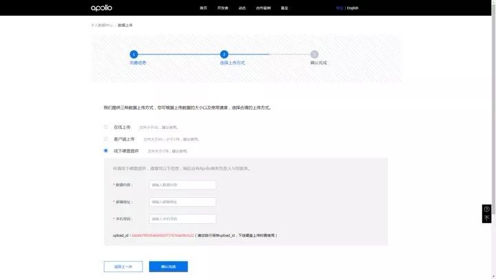 线下交盘方式在填写好数据信息后,会由 Apollo 商务人员直接对接。