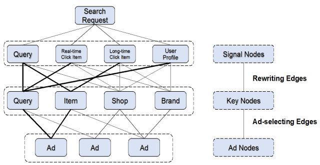 图3:用户行为异构图图示例。图中包含了三种节点:用户搜索信号、广告检索键和广告。用户搜索信号和广告检索键之间的边表示改写,广告检索键和广告之间的边表示广告海选。
