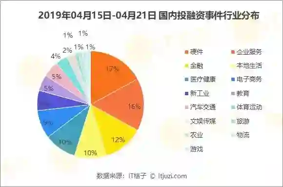 从行业分布来看,硬件行业成为上周发生投融资事件最多的行业,出现 14 起,占比17%;其次,企业服务行业位列第二,发生 13 起投融资事件,占比 16%;金融行业位列第三,发生 10 起投融资并购事件,占比 12%。