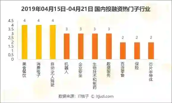 上周最受投资人追捧的子行业依次是美食餐饮、消费电子、自动/无人驾驶、机器人、企业安全、生物技术和制药、数据服务、百货零售、保险、芯片半导体。