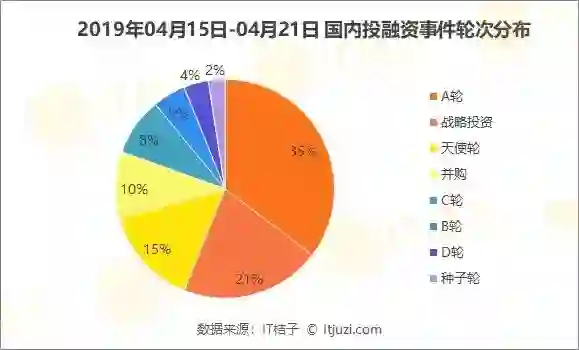 从轮次分布来看,早期投融资事件数量与往常一样占比较大。其中,A 轮投融资事件数量最多,发生 29 起,占比 35%;其次,本周战略投资事件数量占比较往常增长突出,位列第二,发生 17 起,占比 21%;天使轮投资事件数量位列第三,发生 12 起,占比 15%。