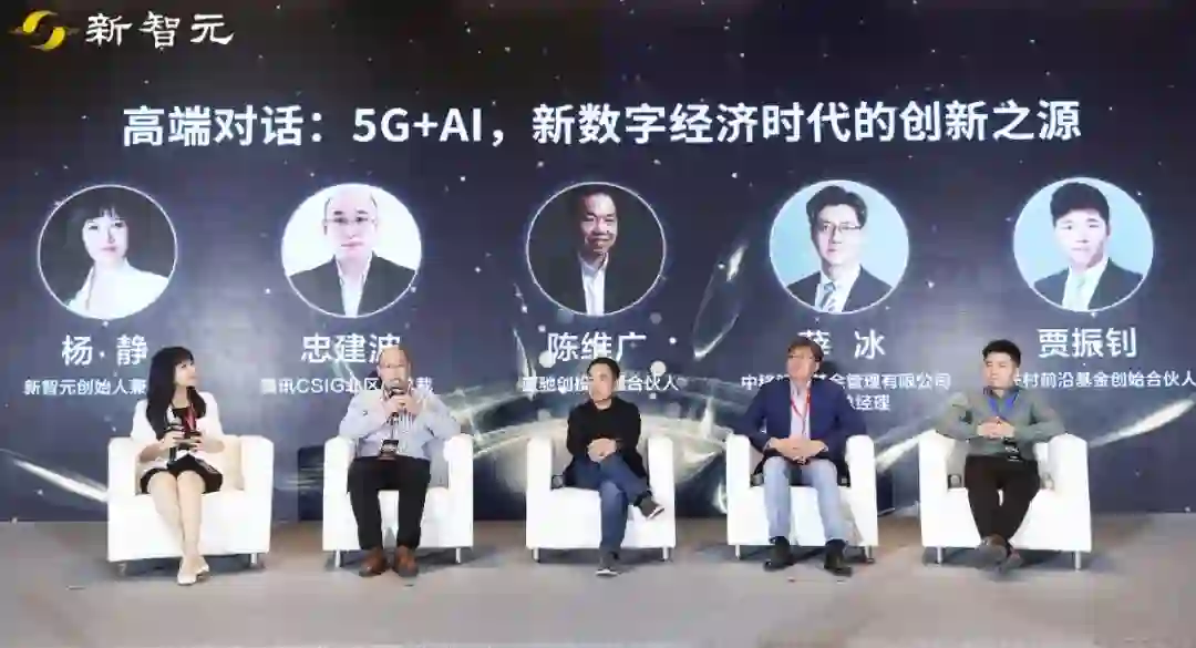 最后的压轴环节,新智元创始人兼CEO杨静,腾讯CSIG北区副总经理忠建波,蓝驰创投管理合伙人陈维广,中移股权基金管理有限公司董事总经理薛冰,以及中关村前沿创始合伙人贾振钊就「5G+AI,新数字经济时代的创新之源」进行了讨探讨。