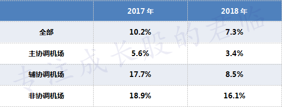2018年是供给侧改革完整的一年,全年民航航班架次增幅大幅下降,起降架次同比增幅减少了2.9个百分点,其中枢纽机场起降架次年度增幅仅有3.4%。