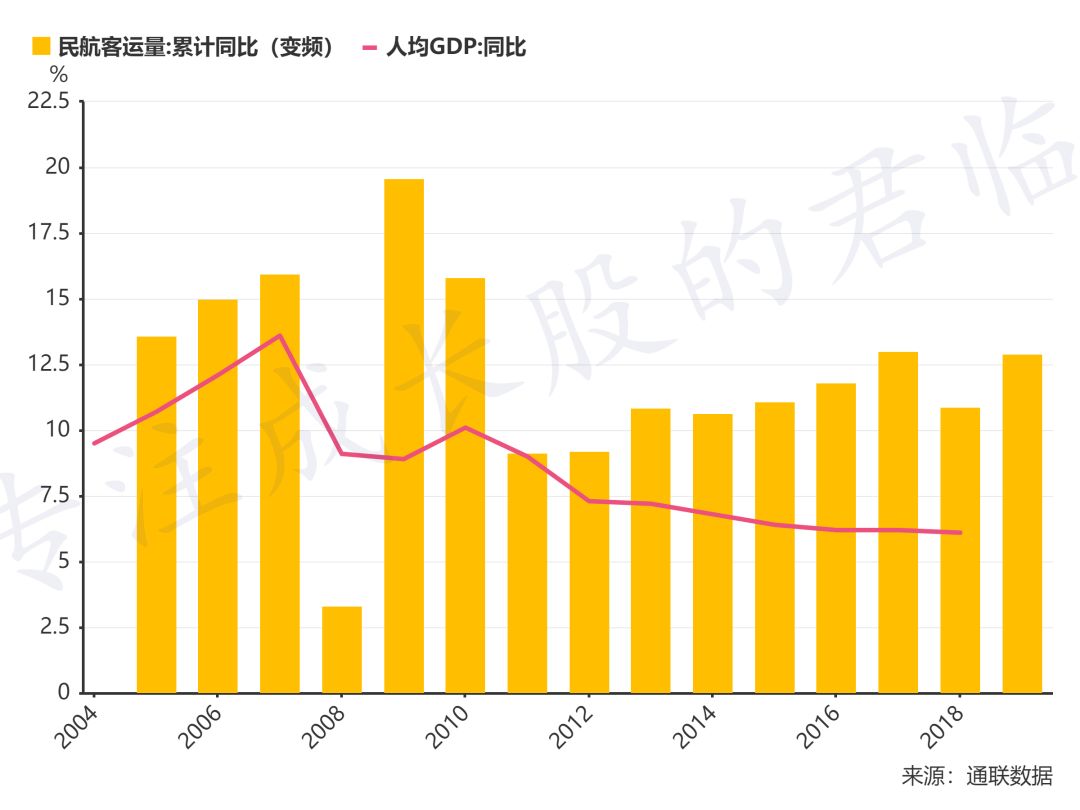 2018,人均GDP增速6.1%,民航客运量增速则是10.9%。