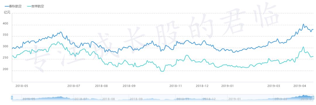 但奇怪的是,春秋市值就是要比吉祥高100亿左右,而且近年还有加大趋势。