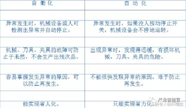 自働化:当品质或设备有异常发生时,设备或生产线具有自动停止或作业员主动使之停止的能力。在这里强调的自働化是带人字旁的动。这时,机器可以判定工作状况的好坏,使一人多机成为可能,生产效率飞跃性提高。带人字边的自动化是指异常时可停止的机器(生产线)