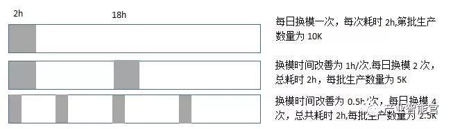 如下图就是一个简单图示说明,假设目前换模时间为2h,生产实践为18h,生产批量为10K。