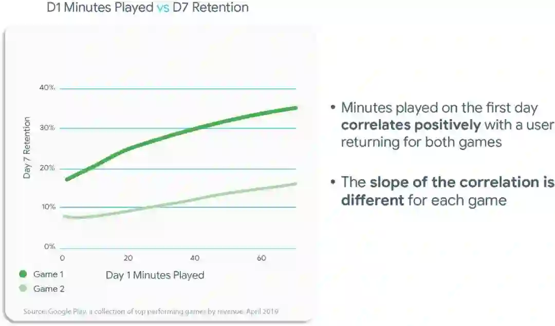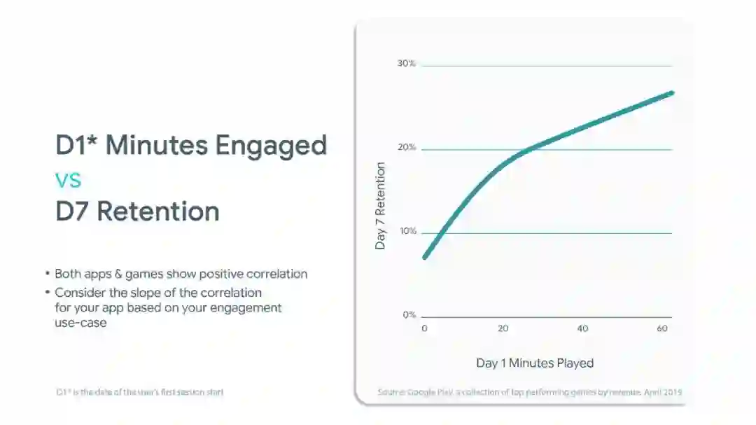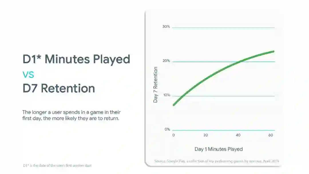 能否及早展现应用价值是长期留存率的关键。观察 Google Play 顶级游戏的数据后,我们发现用户的首日参与体验十分重要。据下图数据所示,新玩家在第一天游戏时间越长,他/她在第七天留下来的几率越大。