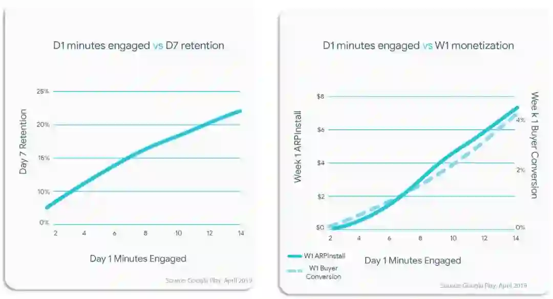 应用的情形与游戏相近。我们收集了 Google Play 顶尖应用的相关数据,并在此基础上绘制了下方两张图表。根据图中曲线所示,玩家在第一天的参与程度越高,游戏收入和留存率也就越高。此外,曲线在前 20 分钟非常陡峭,这说明用户在第一天上手不久后就体会到了应用的价值,因此也就更容易被重新吸引回应用。