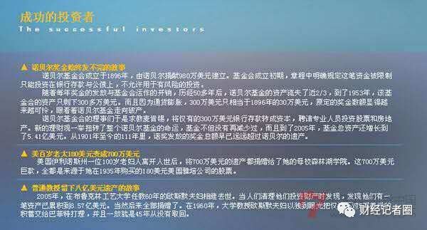 我今天演讲的题目是《复利是最可靠的财富增长方式》,资本市场有很多的财富故事,我们对其中的一些故事特别感兴趣:诺贝尔基金;伊利诺伊州的老妇人;美国一对普通的大学教授的三个投资故事。这是投资的最高境界。