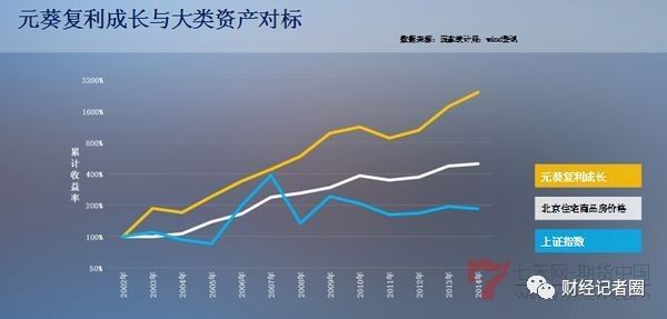 下面这张图非常的有意思,这是我们将元葵复利成长曲线与几个大类资产的比对。