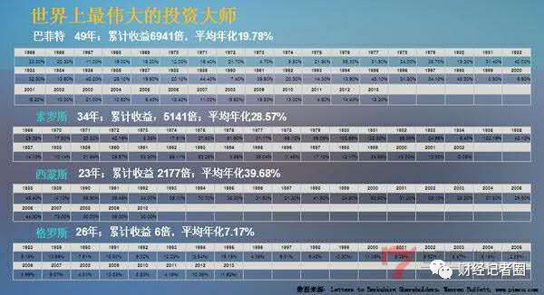 大家不难发现,这几位投资大师的年化收益和之前几位普通投资者基本都在20%-30%附近,而时间的累计成为他们财富增长的重要函数。所以我们说,成功的财富故事都是相同的。