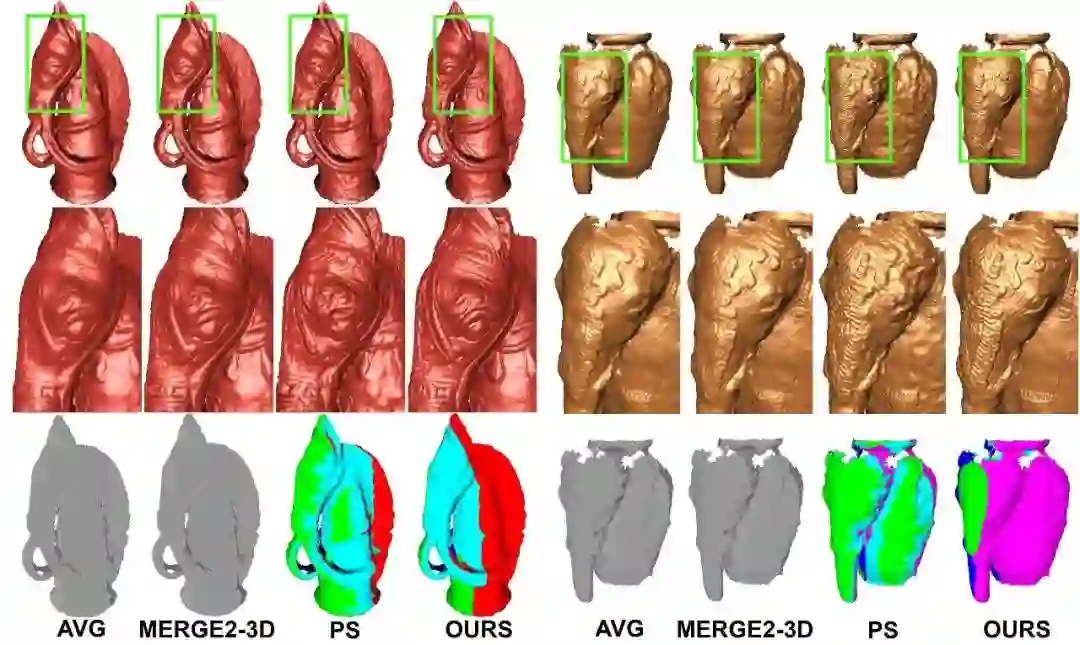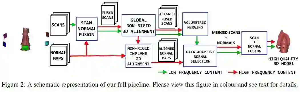 本文提出了一个完整的深度法线融合过程。该方法具有两点创新。首先,本文引入全局多视图非刚性细化步骤,该步骤用于校正深度图与法线图中存在的非刚性偏差。实验证明这种校正对于在最终重建中保留精细尺度的3D特征至关重要。其次,尽管处理过程谨慎,多个法线的平均值也会导致3D细节模糊。因此,本文提出了一种从多个可用法线中选用一个的方法来缓解这一问题。