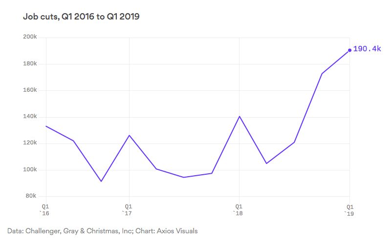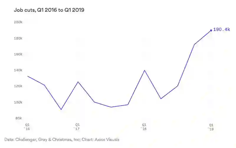 根据猎头公司Challenger, Gray&Christmas上周公布的数据来看,美国在刚刚过去的2019年第一季度经历了2009年来第一季度裁员数量的顶峰——共裁员19万人。