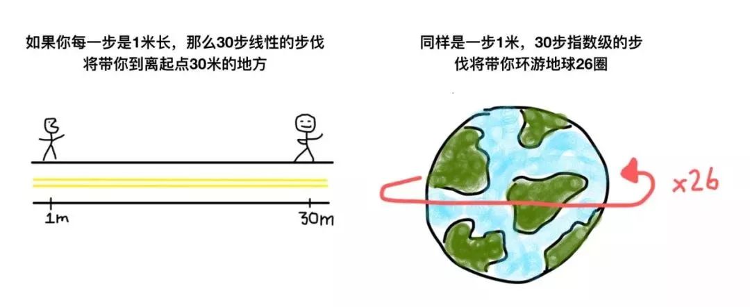 而指数型成长是爆发性的,它会拉着你把你拖到自己都无法想象的距离。