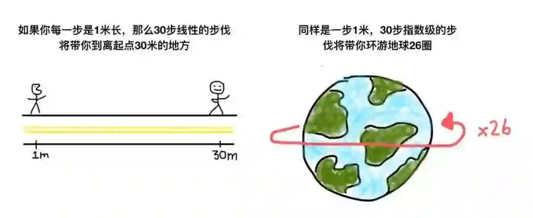 举个例子。假设你正走在一条马路上,你每一步都能迈出1米的距离,你走了6步,也就前进了6米,然后你再走24步,那么就离原点有30米的距离。你很容易知道这30步能把你带到多远,这就是简单地线性成长。