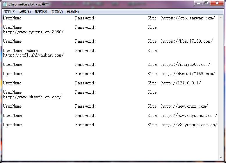 打印'     outFile:         outFile.write('用户名:{0:<20}密码:{1:<20}站点:{2} 无法解密铬密码