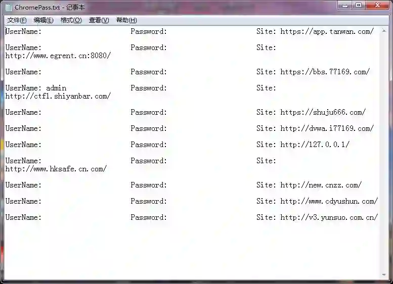 打印' outFile: outFile.write('用户名:{0:<20}密码:{1:<20}站点:{2} 无法解密铬密码