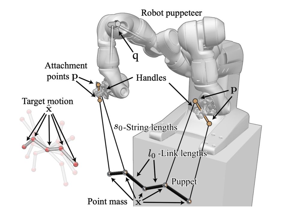PuppetMaster系统包括三个主要部分:机器人木偶操纵者的运动学描述; 机器人可以操作的定制设计的弦驱动牵线木偶; 和目标牵线木偶运动系统的任务重现。
