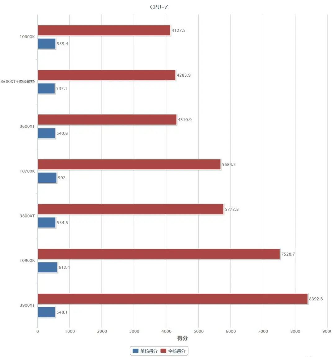 首先是简单直观的CPU-Z测试,这个测试负载相对较小,这个测试里单核成绩intel占优,而全核性能AMD占优。